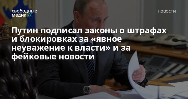 Президент России Владимир Путин подписал законы о штрафах за «явное неуважение к власти» и блокировках за фейковые новости. Соответствующие документы опубликованы на портале правовой информации.