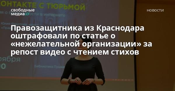 В Краснодаре мировая судья Екатерина Дьяченко оштрафовала на 5 тысяч рублей юриста Юлию Федотову по статье 20.33 КоАП «осуществление деятельности нежелательной организации», сообщает корреспондент Свободных Медиа из суда. Суд посчитал правозащитника виновной из-за репоста видео со чтением стихов.