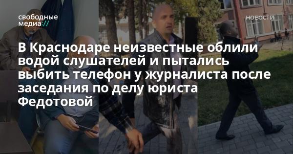 После заседания по делу юриста из Краснодара Юлии Федотовой, которую обвиняют в осуществлении деятельности «нежелательной организации» (статья 20.33 КоАП), неизвестный мужчина облил водой слушателей, а неизвестная женщина пыталась выбить телефон из рук корреспондента Свободных Медиа.