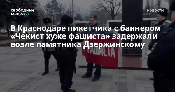 Полиция задержала краснодарца Виталия Молоданова у памятника Феликсу Дзержинскому, когда он стоял в одиночном пикете с баннером «Чекист хуже фашиста», об этом Свободным Медиа сообщил сам Молоданов.