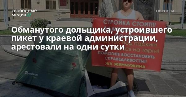 Ленинский районный суд Краснодара арестовал на одни сутки обманутого дольщика ЖК «Жемчужина», который вышел в одиночный пикет с туристической палаткой у краевой администрации.