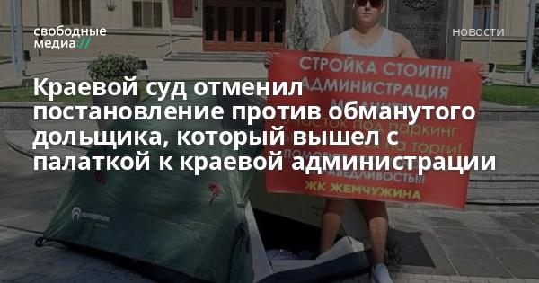 Краснодарский краевой суд отменил постановление о правонарушении по ст. 20.2 ч. 2 КоАП РФ против Владимира Дорофеева, обманутого дольщика ЖК «Жемчужина», который вышел с одиночным пикетом к краевой администрации и установил возле себя туристическую палатку.