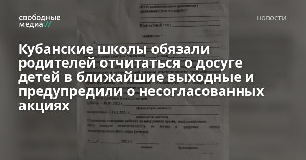 29 января родители кубанских школьников рассказали о получении бланков заявлений, в которых рассказывается о недопустимости участия несовершеннолетних в несогласованных мероприятиях, а также предупреждается об ответственности родителей за неисполнение обязанностей по воспитанию.