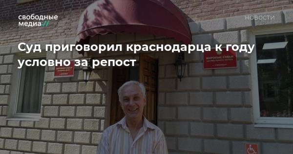 Судья Прикубанского районного суда Краснодара приговорил пенсионера Леонида Малявина к году условно с испытательным сроком в один год за репост, сообщает адвокат Михаил Беньяш.