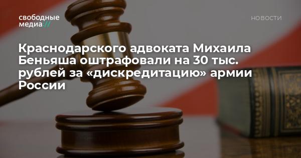 В Краснодаре адвоката Михаила Беньяша признали виновным в «дискредитации» ВС РФ. Дело рассматривала судья Первомайского районного суда краевой столицы Екатерина Игорцева. Она назначила Беньяшу наказание в виде штрафа в 30 тысяч рублей. Отмечается, что самого адвоката на заседании не было, сообщает «Адвокатская улица».