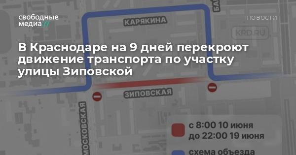 В Краснодаре на участке улицы Зиповской — от имени Байбакова до Московской — с 8:00 10 июня до 22:00 19 июня перекроют движение транспорта. Это требуется для переустройства инженерных сетей, уточнили в пресс-службе администрации Краснодара.
