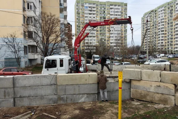 В микрорайоне Гидростроителей 17 февраля возле Парусной, 20/3 жители начали возводить стену из бетонных блоков, сообщает 93.RU.