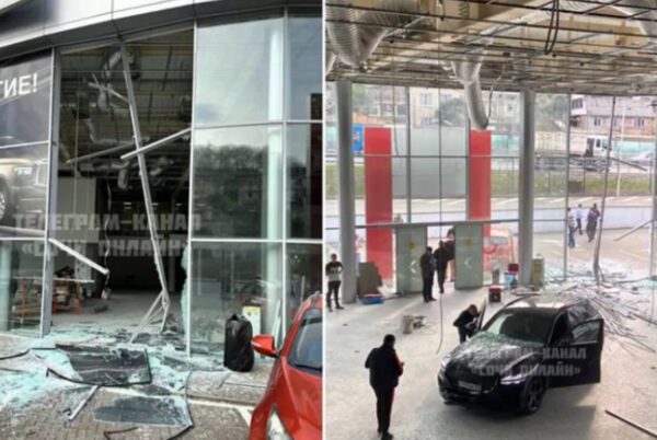 Автомобиль полностью разнес стеклянный фасад строения.