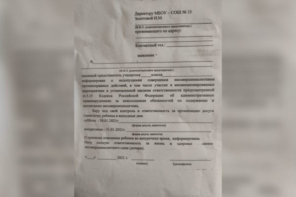 29 января родители кубанских школьников рассказали о получении бланков заявлений, в которых рассказывается о недопустимости участия несовершеннолетних в несогласованных мероприятиях, а также предупреждается об ответственности родителей за неисполнение обязанностей по воспитанию.