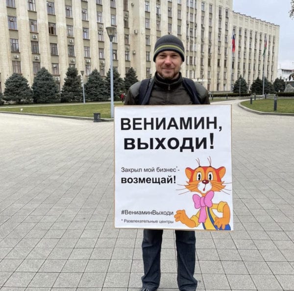 18 декабря владелец развлекательных центров пришёл на пикет к дверям администрации Краснодарского края, сообщает «Туподар Краснодар». Мужчина держит плакат с надписью «Вениамин, выходи! Закрыл мой бизнес — возмещай!».