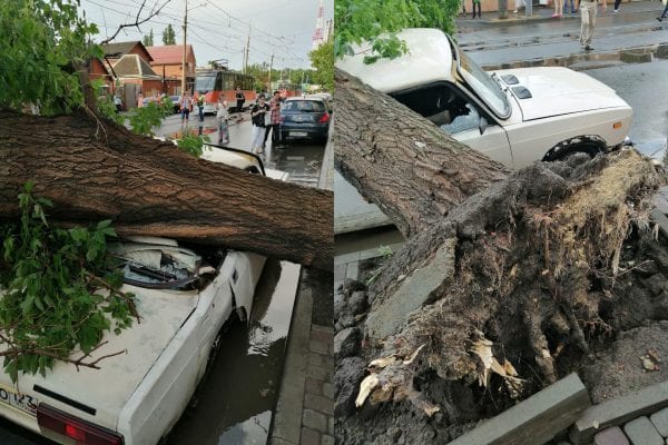 В Краснодаре на пересечении Дмитриевской дамбы и улицы Железнодорожной упало дерево. Растение раздавило автомобиль и повредило контактную сеть.