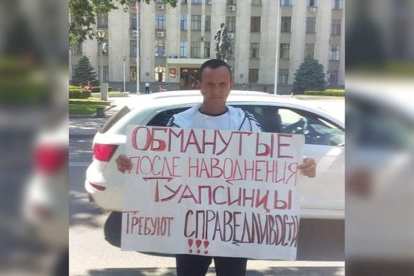 В Краснодаре на одиночный пикет вышел один из пострадавших во время наводнения в октябре 2018 года в Туапсинском районе Михаил Дремов, сообщает «Росбалт».