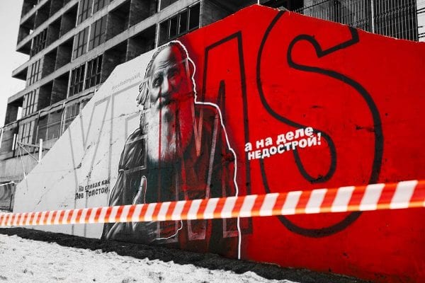 Команда художников Youfeelmyskill нарисовала граффити на недостроенном комплексе в Сочи. На рисунке изображен писатель Лев Толстой и текст «На словах как Лев Толстой, а на деле недострой!».