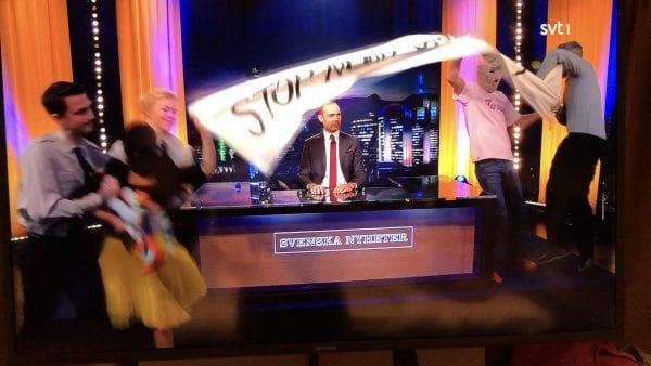Двое активистов из Краснодара, Лусинэ Джанян и Алексей Кнедляковский, находящихся в политической эмиграции в Швеции, развернули плакат против строительства газопровода «Северный поток-2» из России в Германию через Балтийское море.