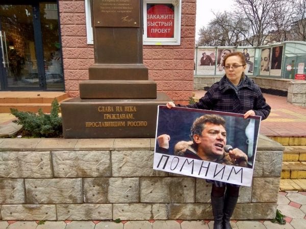 Кубанская активистка Яна Антонова провела пикет в память политика Бориса Немцова в Краснодаре.
