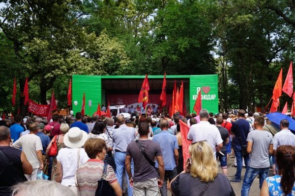 Митинг против повышения пенсионного возраста, организованный КПРФ, прошёл в Краснодаре. По данным организаторов акции, мероприятие посетило около четырёх тысяч человек.