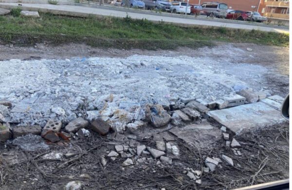 На этой улице – гора строительного мусора с мешками и бутылками.