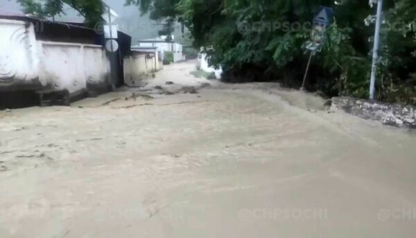 В Сочи 27 июля после сильного ливня река Восточный Дагомыс вышла из берегов и сошёл сель, из-за чего некоторые улицы оказались затопленными.