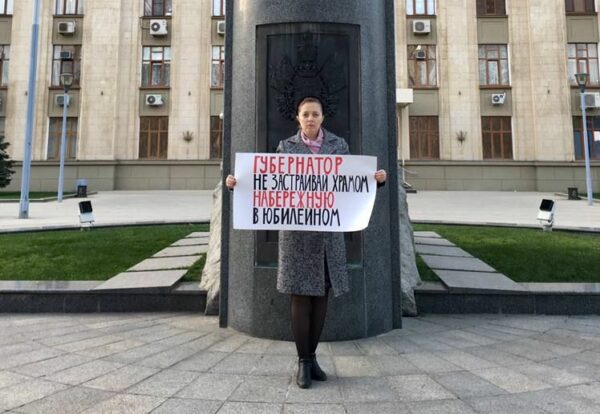 В Краснодаре Яна Антонова провела пикет против строительства храма на аллее 80-летия образования Краснодарского края в ЮМР, сообщила активистка в своём телеграм-канале.