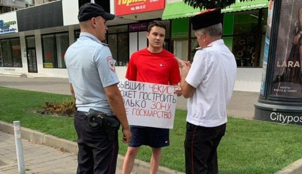 Полиция задержала молодого человека Илью Исаева, когда он стоял с плакатом возле здания управления ФСБ по Краснодарскому краю. На плакате был написан текст: «Бывший чекист может построить только зону, а не государство».